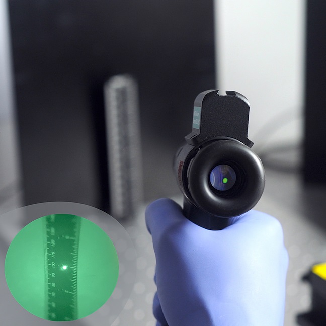 红外观察器将来自选定对象的发射或反射光聚焦到产生电子图像的显像管中。供电(使用电池或电源)时,需要产生 16-19 kV 电压,以将电子图像加速到输出荧光屏中。通过可调节的目镜观察荧光绿光输出 (550 nm)。